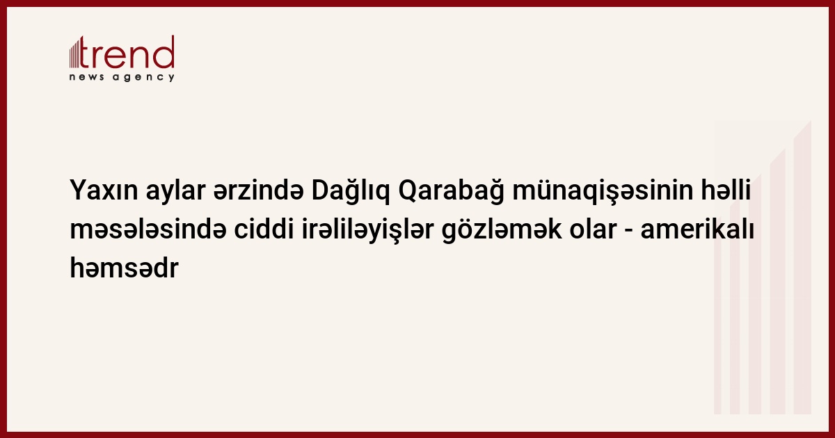 "Tərəflər arasında [Azərbaycan və Ermənistan - Trend ] kifayət qədər etibar var. Yaxın aylar ərzində Dağlıq Qarabağ münaqişəsinin həlli yolunda ciddi irəliləyişlər gözləmək olar", - cümə axşamı Bakıda Minsk qrupunun amerikalı həmsədri Metyu Brazya Trend -un müxbirinə deyib.