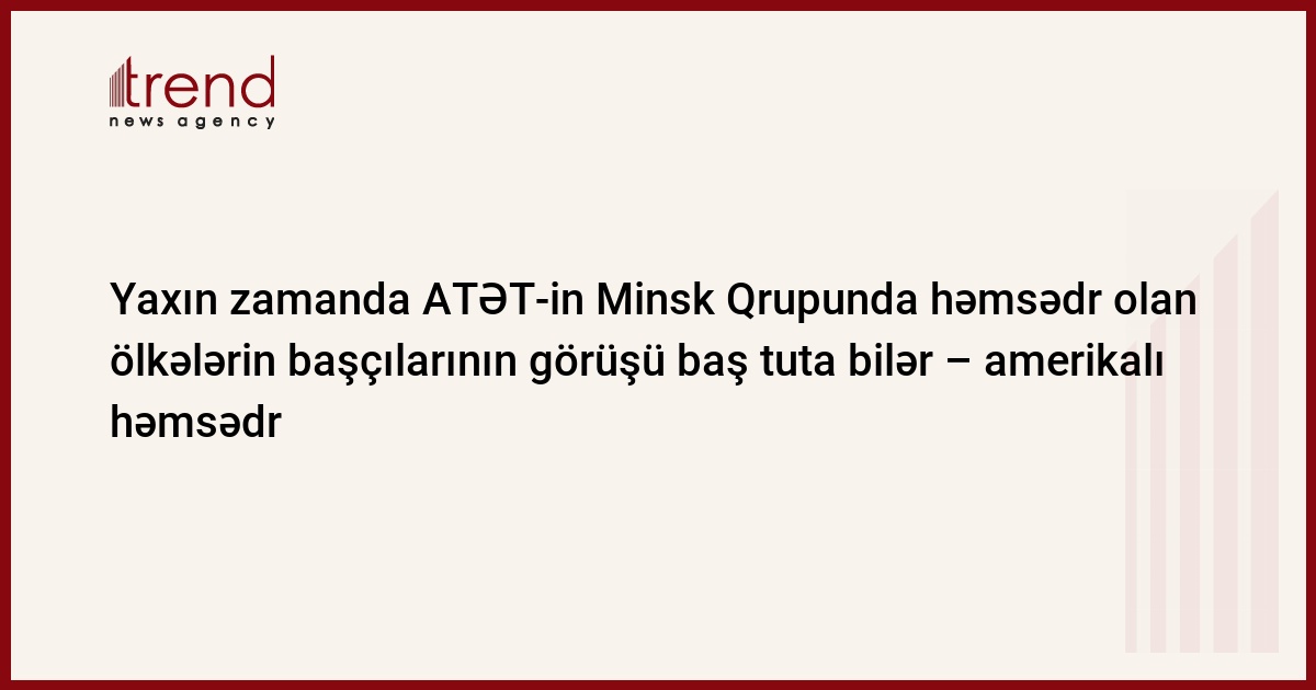 Yaxın zamanda Ermənistan-Azərbaycan münaqişəsinin həlli üzrə ATƏT-in Minsk Qrupu həmsədrləri olan Rusiya, Fransa və ABŞ-ın dövlət başçılarının görüşü baş tuta bilər. Bu haqda cümə axşamı Bakıda jurnalistlərə, ATƏT-in Minsk Qrupunun amerikalı həmsədri Meytu Brayza İrəvan səfərindən sonra deyib. Bir müddət əvvəl o, Minsk Qrupunun fransalı və rusiyalı həmsədrləri ilə birlikdə Ermənistan rəhbərliyi ilə Qarabağ məsələsinin həlli üzrə danışıqları aparıb.
