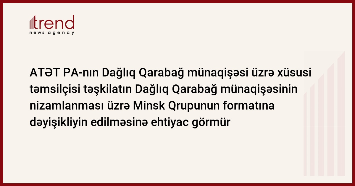 ATƏT-in Parlament Assambleyasının (PA) Dağlıq Qarabağ münaqişəsi üzrə xüsusi təmsilçisi Qoran Lenmarker təşkilatın Dağlıq Qarabağ münaqişəsinin nizamlanması üzrə Minsk Qrupunun formatına dəyişikliyin edilməsinə ehtiyac görmür. Xəbəri Arka yayıb.