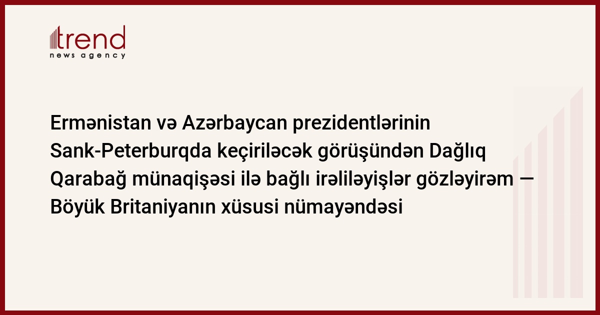 Ermənistan və Azərbaycan prezidentlərinin Sank-Peterburqda keçiriləcək görüşü Dağlıq Qarabağ münaqişəsinin nizamlanması prosesində ciddi irəliləyişlərə imkan yaradacaq. Bu barədə cümə günü Yerevanda jurnalistlərə Böyük Britaniyanın Cənubi Qafqaz üzrə xüsusi nümayəndəsi Brayan Fol bildirib. Xəbəri "Novosti-Armeniya" yayıb.