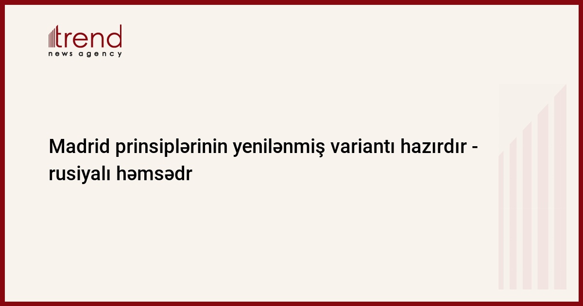 "Madrid prinsipləri artıq yenilənib, biz Krakovda (Polşa) ATƏT-in Minsk qrupu həmsədrlərinin iyulun sonunda keçirilən görüşü zamanı bunun üzərində işləmişik", - Trend -a Moskvadan telefonla rusiyalı həmsədr Yuri Merzlyakov bildirib.