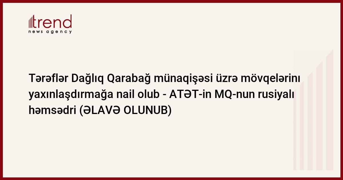 Tərəflər Dağlıq Qarabağ münaqişəsi üzrə mövqelərinı yaxınlaşdırmağa nail olub, ATƏT-in MQ-nun rusiyalı həmsədri Yuri Merzlyakov bu gün Kişinyovda Azərbaycan və Ermənistan prezidentləri İlham Əliyev və Serj Sarkisyanın Dağlıq Qarabağ münaqişəsinin sülh yolu ilə həlli məsələsi üzrə il yarım ərzində sayca yeddinci görüşünün yekunları üzrə bəyanatında bildirib.