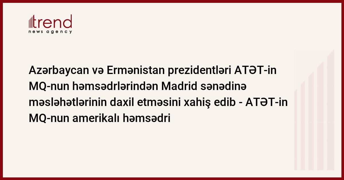 Azərbaycan və Ermənistan prezidentləri ATƏT-in MQ-nun həmsədrlərindən Madrid sənədinə məsləhətlərinin daxil etməsini xahiş edib. Bu barədə cümə günü Kişinyovda ATƏT-in MQ-nun amerikalı həmsədri Robert Bradtke Azərbaycan və Ermənistan prezidentlərinin görüşünün yekunları üzrə bəyanatında bildirib.