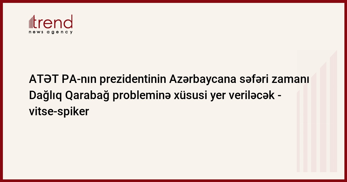 Azərbaycanın vitse-spikeri bildirib ki, ATƏT PA-nın prezidentinin ölkəmizə səfəri zamanı Dağlıq Qarabağ probleminin həlli məsələsinə xüsusi yer veriləcək.