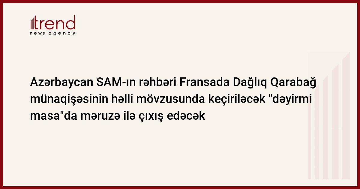 Azərbaycan Prezidenti yanında Strateji Araşdırmalar Mərkəzinin (SAM) rəhbəri Elxan Nuriyev martın 31-də Fransada Beynəlxalq Münasibətlər və Strateji Araşdırmalar İnstitutunda "Dağlıq Qarabağ timsalında Cənubi Qafqazda münaqişələrin həll perspektivləri" mövzusunda keçiriləcək "dəyirmi masa"da əsas məruzəçi qismində iştirak edəcək. Bu barədə Trend -a SAM-dən bildiriblər.