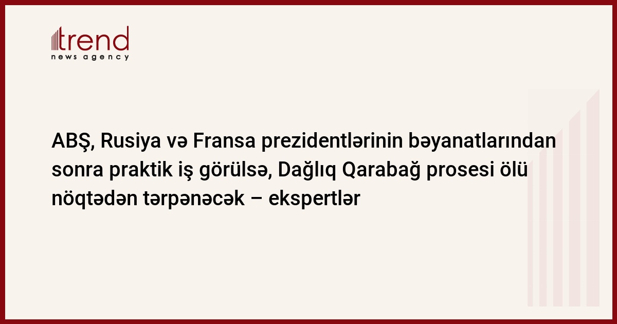 ABŞ, Rusiya və Fransa prezidentlərinin Dağlıq Qarabağ üzrə birgə bəyanatları praktik iş görüləcəyi halda təsiredici olacaq. Lakin bəyanat faktı öz-özlüyündə Bakının mövqeyini əks etdirir, Azərbaycanın dünya liderləri üçün əhəmiyyətli rolundan xəbər verir.