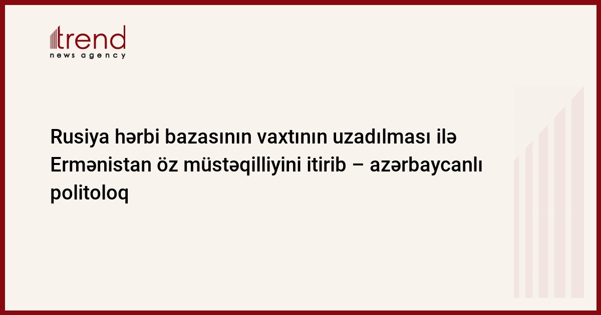 Rusiya hərbi bazasının vaxtının uzadılması ilə Ermənistan öz müstəqilliyini itirib. Trend-in məlumatına görə, bu barədə Siyasi İnnovasiyalar və Texnologiyalar Mərkəzinin direktoru Mübariz Əhmədoğlu çərşənbə günü keçirdiyi mətbuat konfransında bildirib.