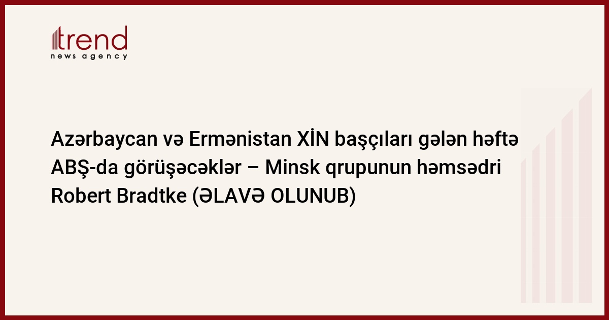 Azərbaycan və Ermənistan XİN başçıları gələn həftə ABŞ-da görüşəcəklər. Bu barədə ATƏT Minsk qrupunun amerikalı həmsədri Robert Bradtke BBC-yə müsahibəsində deyib.