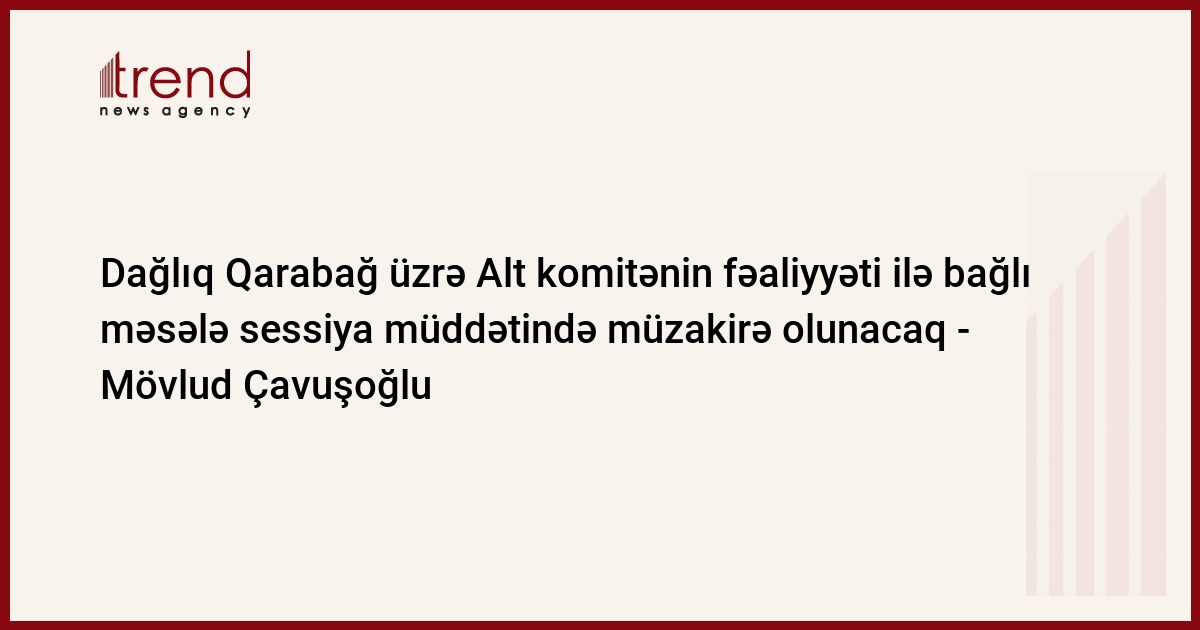 Dağlıq Qarabağ üzrə Alt komitənin fəaliyyəti ilə bağlı məsələ sessiya müddətində müzakirə olunacaq. Trend-in məlumatında görə, bu fikirləri Avropa Şurası Parlament Assambleyasının (AŞ PA) sədri Mövlud Çavuşoğlu qurumun bazar ertəsi öz işinə başlayan plenar sessiyası çərçivəsində jurnalistlər üçün keçirdiyi mətbuat konfransında Dağlıq Qarabağ üzrə Alt komitənin fəaliyyətinə münasibət bildirərkən deyib.