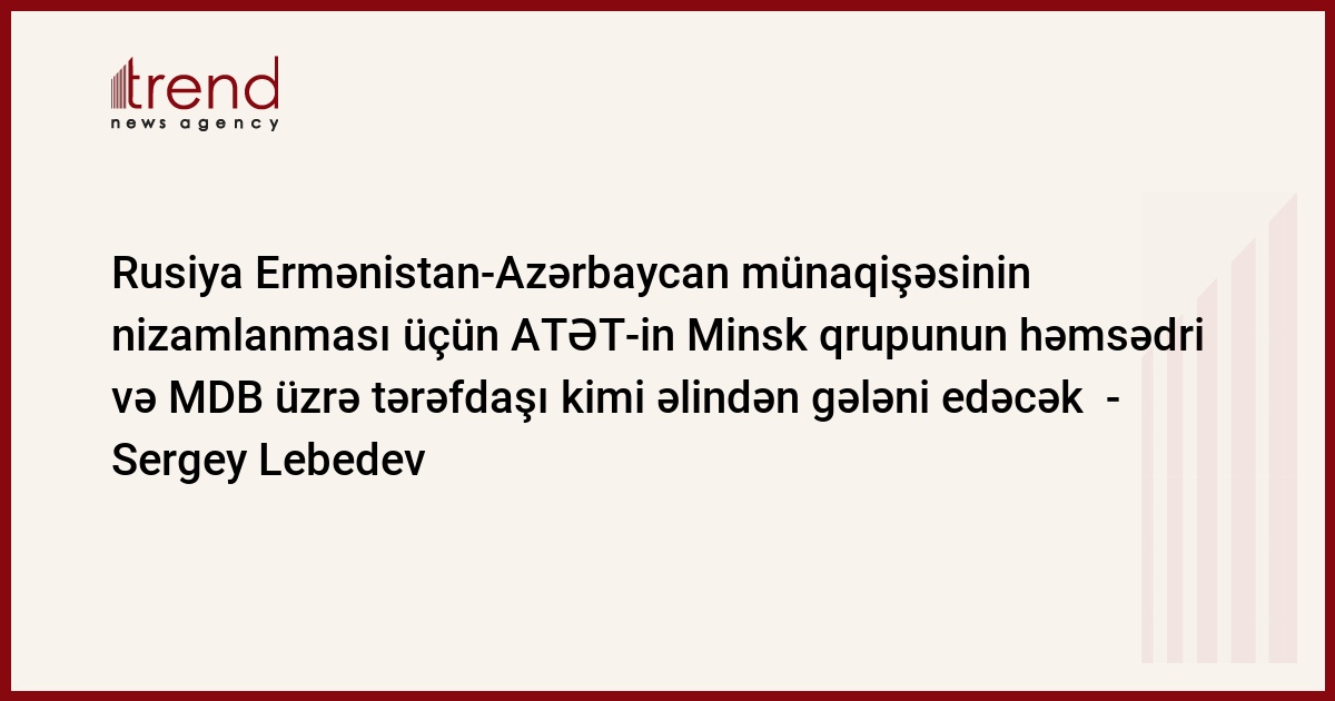 "Münaqişə hər iki dövlətə yaşamaqda mane olur. Onlar bir-birinin yanında, birlikdə yaşamağa məhkumdurlar. Buna görə Rusiya onları yaxınlaşdırmaq üçün həm ATƏT-in Minsk qrupunun həmsədri, həm bu ölkələrin MDB üzrə tərəfdaşı, həm də qonşu ölkə kimi əlindən gələni edəcək", - Lebedev bilıdirib.