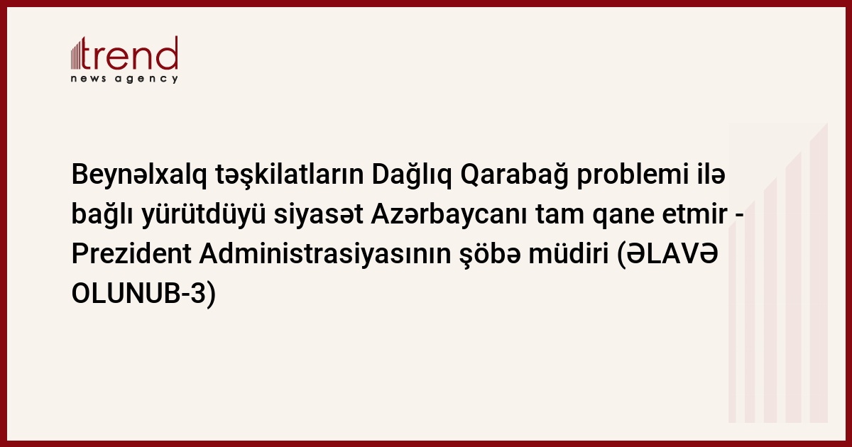 Son zamanlar beynəlxalq təşkilatların Dağlıq Qarabağ problemi ilə bağlı yürütdüyü siyasət Azərbaycanı tam qane etmir. Trend-in məlumatına görə, bunu çərşənbə günü jurnalistlərə Prezident Administrasiyasının İctimai siyasi məsələlər şöbəsinin müdiri Əli Həsənov bildirib.