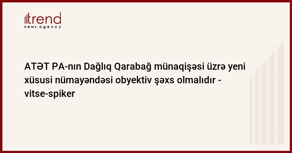 ATƏT-in Parlament Assambleyasının (PA) Dağlıq Qarabağ münaqişəsi üzrə yeni xüsusi nümayəndəsi obyektiv və təcrübəli şəxs olmalıdır. Trend-in məlumatına görə, bu fikirləri hakim Yeni Azərbaycan Partiyasının (YAP) rəsmi internet saytına açıqlamasında Milli Məclisin sədr müavini,ATƏT PA-da Azərbaycan nümayəndə heyətinin rəhbəri Bahar Muradova deyib.