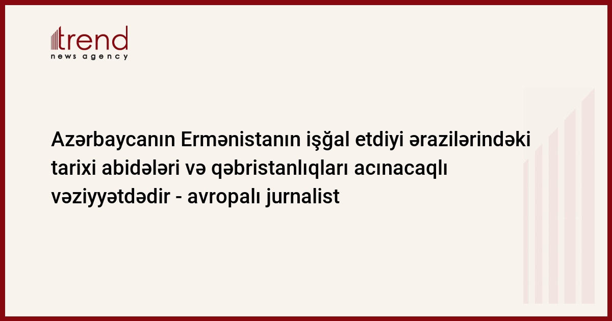 Azərbaycanın Ermənistanın işğal etdiyi ərazilərindəki tarixi abidə və qəbristanlıqları acınacaqlı vəziyyətdədir. Bu barədə Trend-ə "Wochenzeitung" və "Neues Deutschland" (İsveçrə) nəşrlərinin jurnalisti Andre Vidmer bildirib.