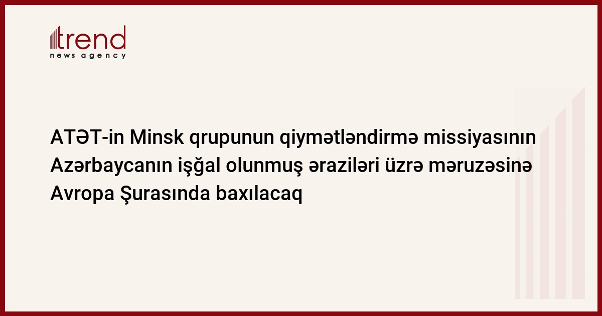 ATƏT-in Minsk qrupunun səhra qiymətləndirmə missiyasının Azərbaycanın işğal olunmuş əraziləri üzrə məruzəsinə Avropa Şurasında baxılacaq. Bu barədə cümə günü Trend-ə Azərbaycanın AŞ-dakı daimi nümayəndəsi Arif Məmmədov məlumat verib.