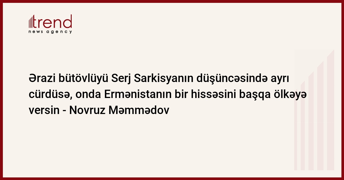 Ərazi bütövlüyü Serj Sarkisyanın düşüncəsində başqa cürdürsə, onda Ermənistanın bir hissəsini bir ölkəyə, başqa bir hissəsini digər ölkəyə versin. Bunu bazar ertəsi Trend-ə Azərbaycan Prezidenti Administrasiyasının Xarici əlaqələr şöbəsinin müdiri Novruz Məmmədov Ermənistan prezidenti Serj Sarkisyanın Rusiyanın "Moskovskiye Novosti" qəzetinə açıqlamasına münasibət bildirərkən deyib.