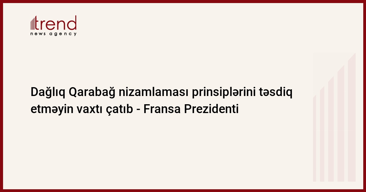 Dağlıq Qarabağ münaqişəsinin nizamlanmasına dair sonrakı danışıqlar üçün əsas ola biləcək prinsipləri təsdiqləməyin vaxtı çatıb. Bu barədə Fransa Prezidenti Nikola Sarkozinin Ermənistan Prezidenti Serj Sarkisyana müraciətində deyilir. Trend-in məlumatına görə, xəbəri "Mediamaks" agentliyi Ermənistan Prezidentinin mətbuat xidmətinə istinadən yayıb.