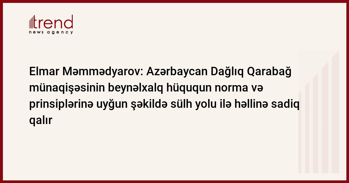 "Azərbaycan hökuməti bu uzun sürən münaqişənin beynəlxalq hüququn norma və prinsiplərinə uyğun şəkildə, BMT TŞ və İƏT qətnamələrinin yerinə yetirilməsi, eyni zamanda, ATƏT, AŞ və Avropa Parlamenti tərəfindən qəbul edilmiş müvafiq sənədlər və qərarlar əsasında sülh yolu ilə həllinə sadiq qalır", - Məmmədyarov deyib, məlumatı bazar ertəsi XİN-in mətbuat xidməti yayıb.