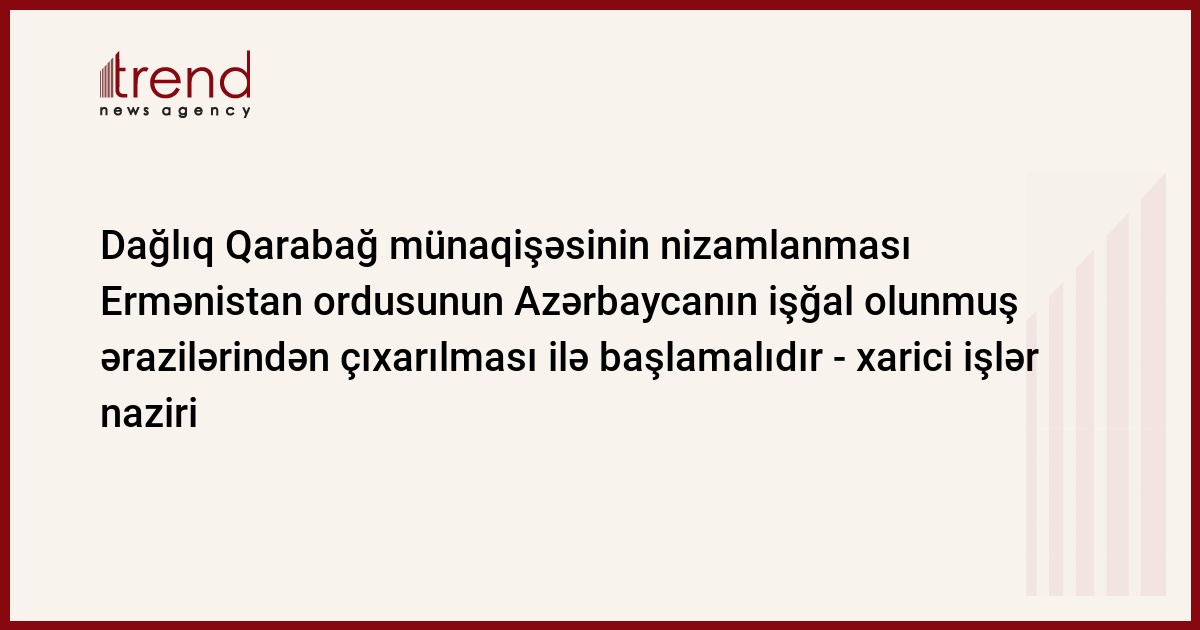 "Azərbaycan əmindir ki, Dağlıq Qarabağ münaqişəsinin nizamlanması razılaşdırılmış vaxtda Ermənistan Silahlı Qüvvələrinin işğal olunmuş ərazilərdən çıxarılması ilə başlamalı və kommunikasiyaların bərpası, qaçqın və məcburi köçkünlərin qayıtması və Azərbaycanın ərazi bütövlüyü çərçivəsində Dağlıq Qarabağ münaqişəsi regionunda azərbaycanlıların və ermənilərin birgə yaşaması üçün şəraitin yaradılması ilə nəticələnməlidir", - Məmmədyarov bildirib.