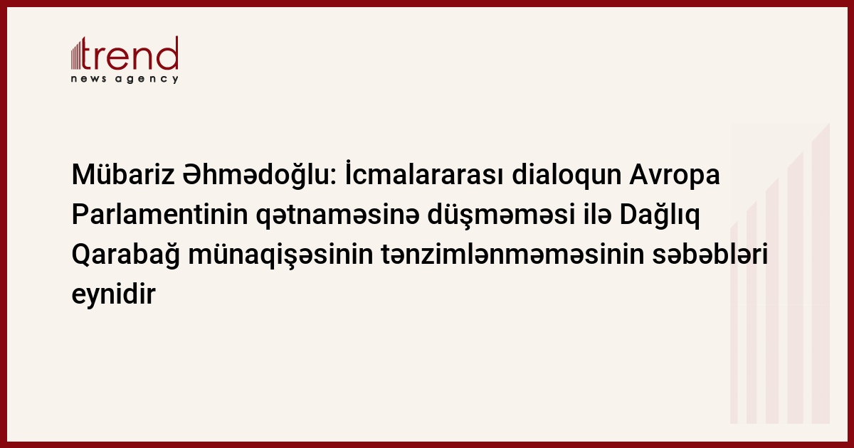 Dağlıq Qarabağın azərbaycanlı və erməni icmaları arasında dialoqun Avropa Parlamentinin qətnaməsinə düşməməsi ilə Dağlıq Qarabağ münaqişəsinin tənzimlənməməsinin səbəbləri eynidir. Bunu cümə günü Trend-ə Siyasi İnnovasiya və Texnologiya Mərkəzinin rəhbəri, politoloq Mübariz Əhmədoğlu deyib.