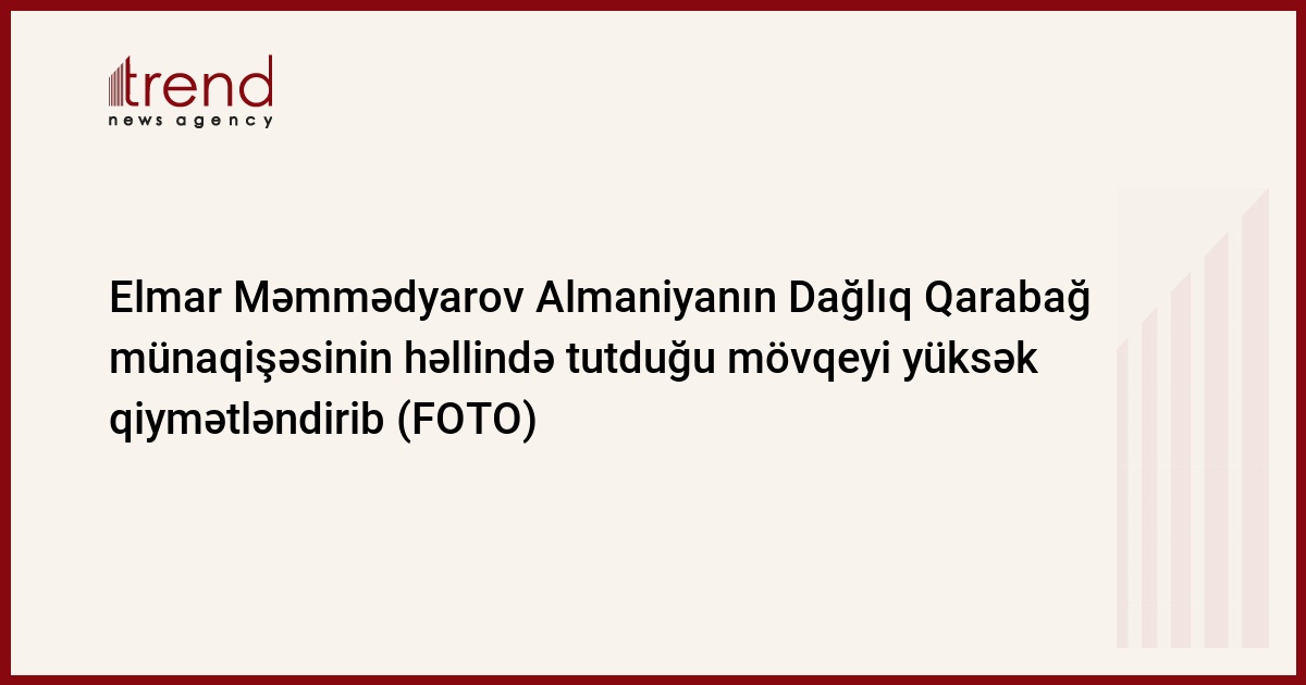 Almaniyanın Azərbaycanın suverenliyi və ərazi bütövlüyünə verdiyi dəstəyi və Ermənistan-Azərbaycan münaqişəsinin həllində tutduğu mövqeyi yüksək qiymətləndirib. O, həmçinin Azərbaycanın Almaniya ilə ikitərəfli münasibətləri mədəniyyət və humanitar sahələr də daxil olmaqla bundan sonra daha da genişləndirməkdə maraqlı olduğunu vurğulayıb.