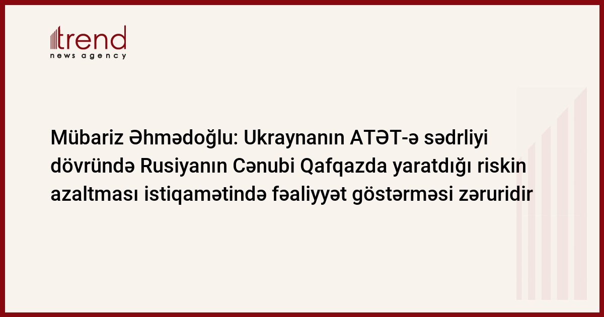 Ukraynanın ATƏT-ə sədrliyi dövründə Rusiyanın Cənubi Qafqazda yaratdığı riskin azaldılması istiqamətində fəaliyyət göstərməsi indi zəruridir. Trend xəbər verir ki, bunu Siyasi İnnovasiya və Texnologiyalar Mərkəzinin direktoru, politoloq Mübariz Əhmədoğlu çərşənbə günü keçirdiyi mətbuat konfransında bildirib.