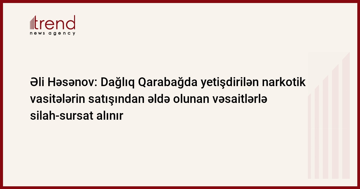 Ermənistan tərəfindən işğal olunmuş Dağlıq Qarabağda 20 ildir ki, külli miqdarda narkotik vasitələr yetişdirilir və bunun satışından əldə olunan vəsaitlərlə silah-sursat alınır. Trend-in məlumatına görə, bunu jurnalistlərə Baş nazirin müavini, Narkomanlığa və Narkotik Vasitələrin Qanunsuz Dövriyyəsinə Qarşı Mübarizə üzrə Dövlət Komissiyasının sədri Əli Həsənov bildirib.