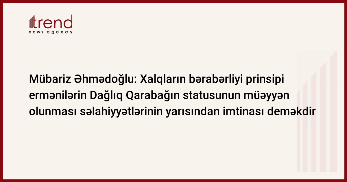 Əhmədoğlu deyib ki, erməni düşüncəsinin əcaibliyi orasındadır ki, statusun müəyyən olunmasında xalqların bərabərliyini öz xeyirlərinə başa düşürlər: "Bir az da sadələşdirək: tənzimlənmə sənədləri və prinsiplərinə görə, Dağlıq Qarabağın statusunun müəyyən olunmasının 50 faizi və ya yarısı Dağlıq Qarabağ ermənilərinə məxsusdur, çünki "xalqların bərabərliyi" termini azərbaycanlıları və erməniləri statusun müəyyən olunmasında bərabər tutur; qalan 50 faizi isə ermənilərə məxsus olmayacaqdır. Bu 50 faizin Azərbaycan dövlətinə, Azərbaycan xalqına və ya Dağlıq Qarabağ azərbaycanlılarına aid olmasının ermənilər üçün fərqi varsa, biz o fərqi nəzərə alarıq; təki Dağlıq Qarabağın statusunun müəyyən olunmasının yarısınından özləri könüllü şəkildə imtina etsinlər. Belə olacaqsa, Azərbaycan xalqı və ya dövləti həmin səlahiyyəti, yəni Dağlıq Qarabağın statusunun müəyyən olunmasının 50 faizlik payını Dağlıq Qarabağ azərbaycanlılarına hədiyyə edəcəkdir".