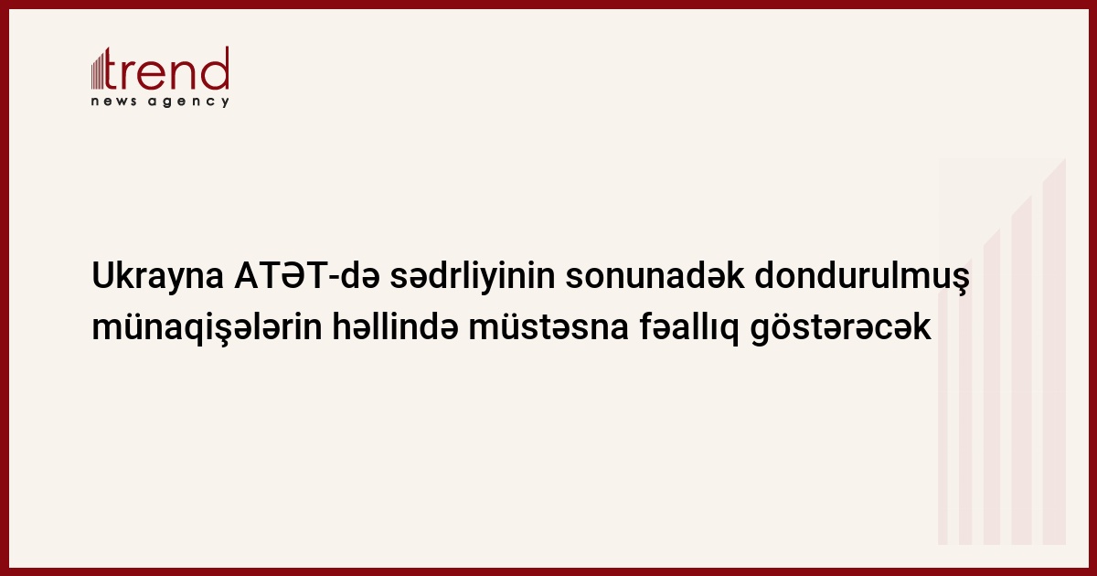 Ukrayna ATƏT-də sədrliyinin sonunadək dondurulmuş münaqişələrin həllində müstəsna fəallıq göstərəcək. Trend-in məlumatına görə, bu barədə ATƏT-in fəaliyyətdə olan sədri, Ukrayna xarici işlər naziri Leonid Kojara "İnterfax"a müsahibəsində deyib.