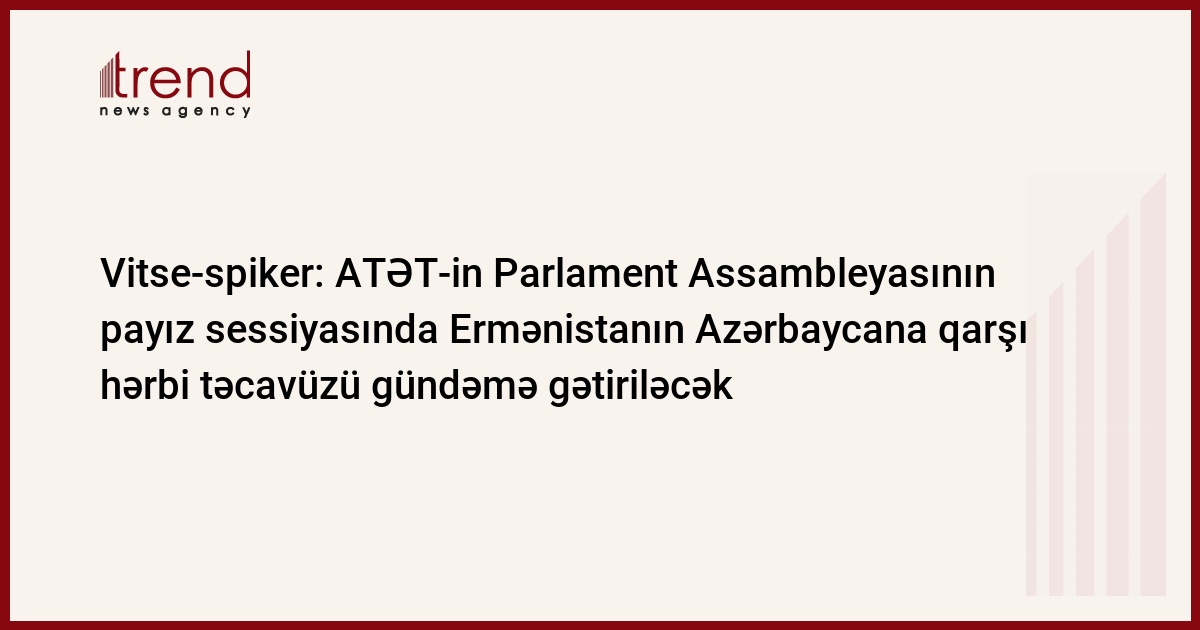 ATƏT-in Parlament Assambleyasının payız sessiyası oktyabrın 13-14-də Monteneqronun Budva şəhərində keçiriləcək. Trend-in məlumatına görə, bu barədə Yeni Azərbaycan Partiyasının saytına Milli Məclisin sədr müavini, ATƏT-in Parlament Assambleyasında Azərbaycanın nümayəndə heyətinin rəhbəri Bahar Muradova deyib.