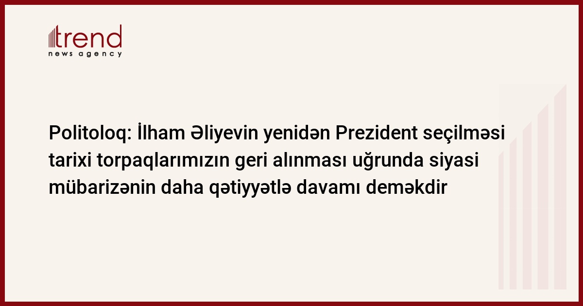İlham Əliyevin yenidən Prezident seçilməsi tarixi torpaqlarımızı Ermənistandan almaq uğrunda siyasi mübarizənin daha qətiyyətlə davam etdirilməsi deməkdir. Bu barədə Trend-ə Siyasi İnnovasiya və Texnologiya Mərkəzinin direktoru, politoloq Mübariz Əhmədoğlu bildirib.