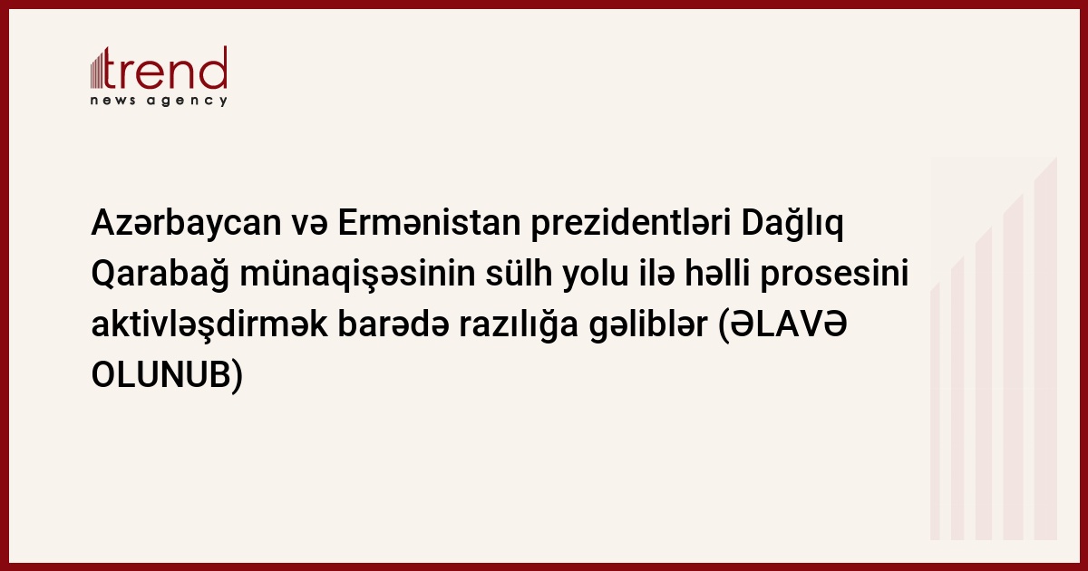 Azərbaycan və Ermənistan prezidentləri İlham Əliyev və Serj Sarkisyan Dağlıq Qarabağ münaqişəsinin sülh yolu ilə nizamlanması prosesini aktivləşdirmək barədə razılığa gəliblər.