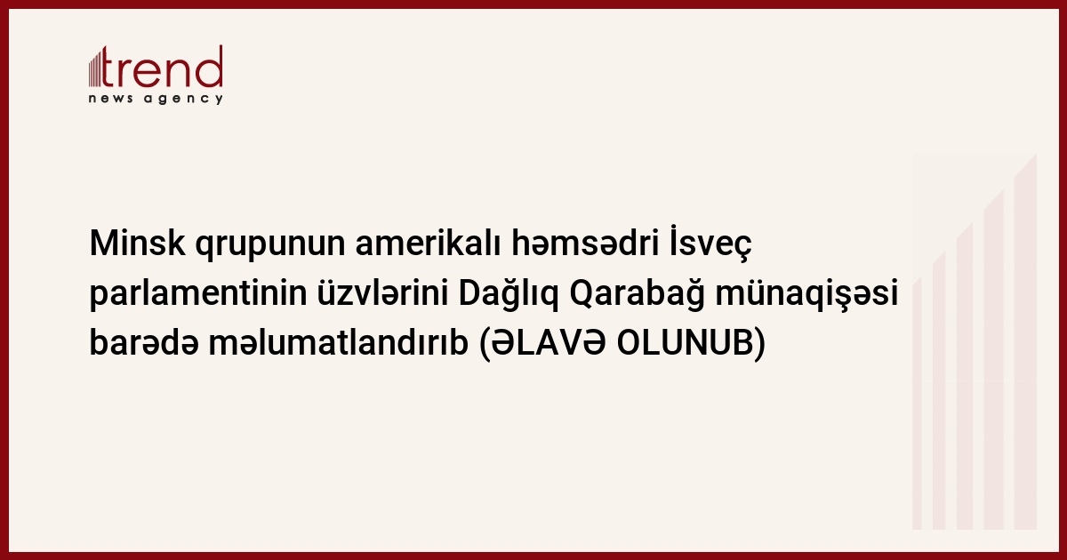 Qeyd edək ki, ATƏT-in Minsk qrupunun amerikalı həmsədri Dağlıq Qarabağ münaqişəsi ilə bağlı İsveç hökuməti ilə müzakirələr aparıb.