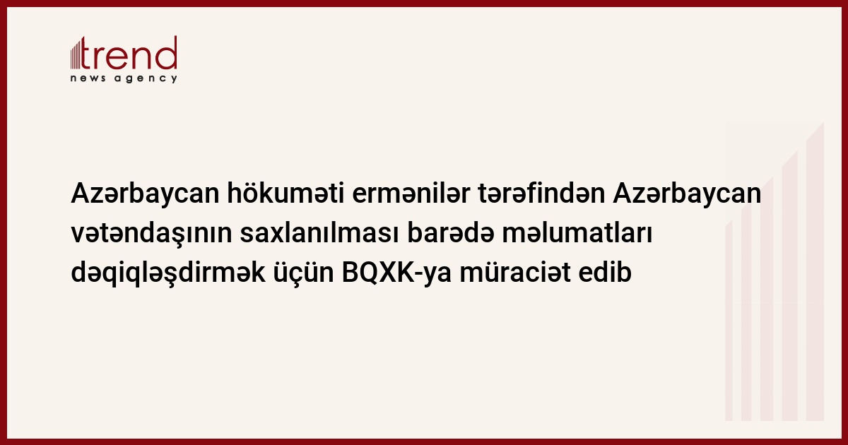 Azərbaycanın hakimiyyət orqanları Ermənistan tərəfindən işğal edilmiş ərazilərdə Azərbaycan vətəndaşının saxlanılması haqqında kütləvi informasiya vasitələrində gedən məlumatları dəqiqləşdirmək üçün Beynəlxalq Qızıl Xaç Komitəsinə (BQXK) müraciət ediblər.