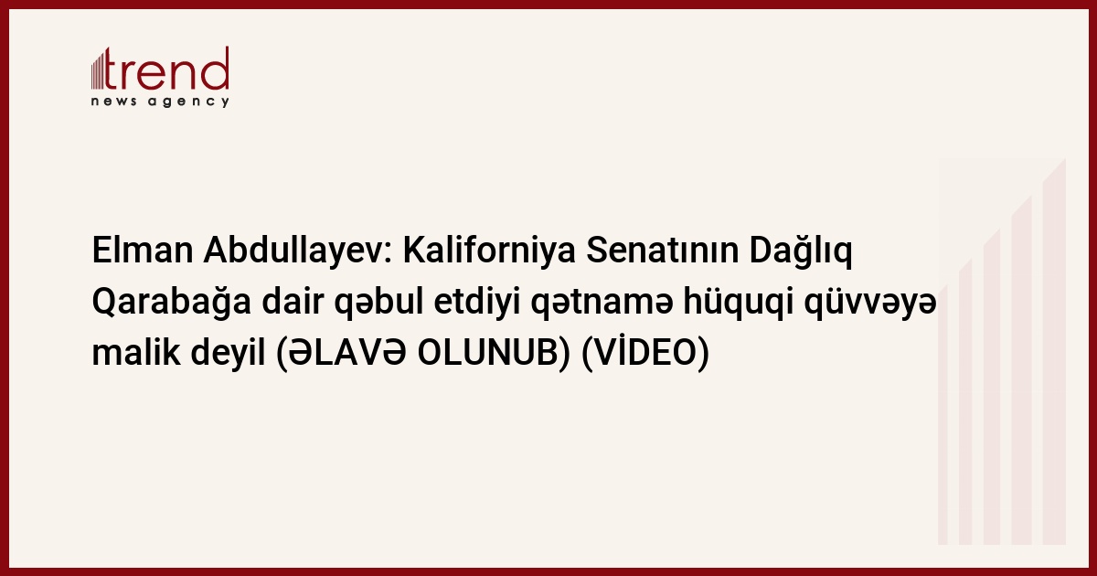 Kaliforniya ştatı Senatının Dağlıq Qarabağa dair qəbul etdiyi qətnamə bəyannamə xarakteri daşıyır və hüquqi qüvvəyə malik deyil. Trend-in məlumatına görə, bunu Azərbaycan XİN-in rəsmi nümayəndəsi Elman Abdullayev cümə axşamı brifinqdə Kaliforniya ştatı Senatının Dağlıq Qarabağa dair qəbul etdiyi qətnaməni şərh edərkən bildirib.
