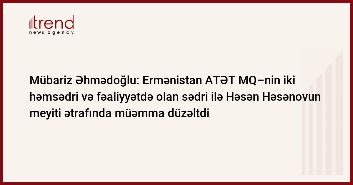 Ermənistan ATƏT-in Minsk qrupunun iki həmsədri və fəaliyyətdə olan sədrin iştirakı ilə Azərbaycanın işğal olunmuş Kəlbəcər rayonunda ermənilər tərəfindən öldürülmüş Həsən Həsənovun meyiti ətrafında müəmma düzəltdi. Trend xəbər verir ki, bunu Siyasi İnnovasiya və Texnologiyalar Mərkəzinin direktoru, politoloq Mübariz Əhmədoğlu bu gün keçirdiyi mətbuat konfransında bildirib.