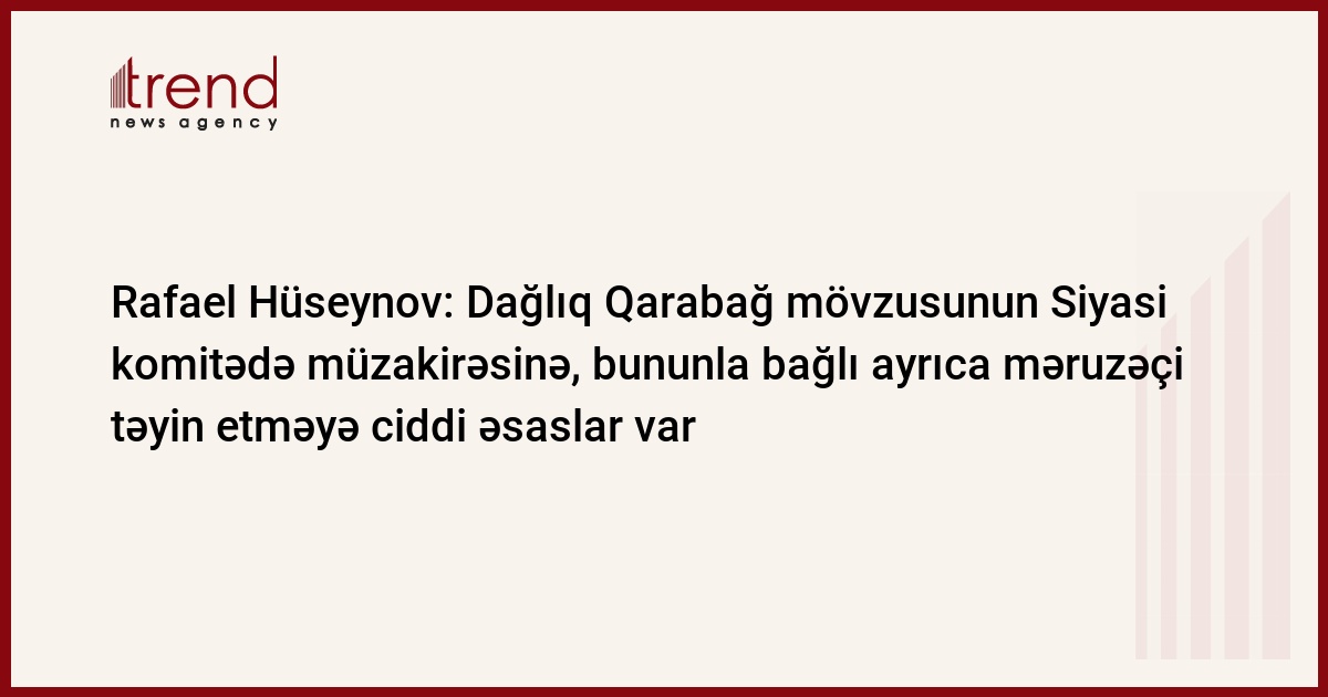 "Azərbaycanın Dağlıq Qarabağ regionu və digər işğal edilmiş əraziləri mövzusunun Siyasi komitədə müzakirəsinə, bununla bağlı ayrıca məruzəçi təyin etməyə ciddi əsaslar var". Trend-in məlumatına görə, bu fikirləri Avropa naminə Liberal və Demokratların Alyansı (ALDE) partiya qrupunun bu gün keçirilən iclasında Azərbaycanın AŞ PA-dakı nümayəndə heyətinin üzvü Rafael Hüseynov səsləndirilib.