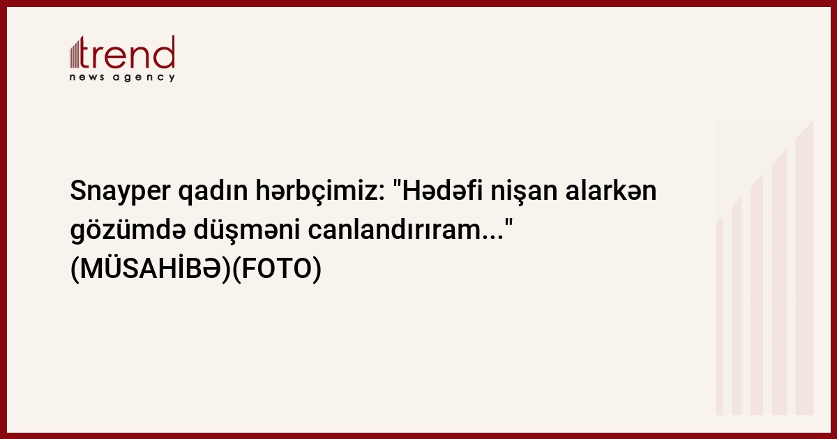 Trend Müdafiə Nazirliyinin saytına istinadən snayper qadın hərbçimiz Könül Məmmədli ilə müsahibəni təqdim edir. Könül Şakir qızı Məmmədli - 1982-ci ildə Sumqayıtda anadan olub. Ali təhsillidir. 2014-cü ildən hərbi xidmətdədir.