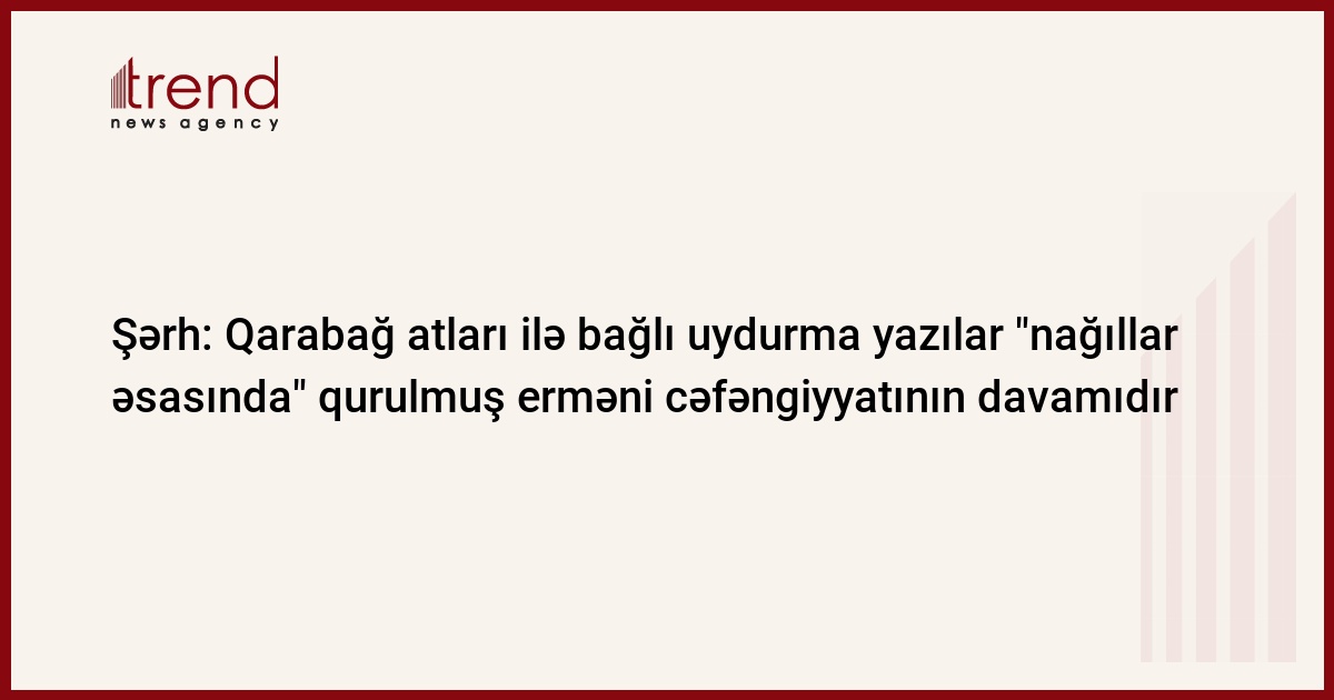 Trend-in Agentliyin saytına istinadən verdiyi məlumata görə, şərhdə qeyd olunur ki, son zamanlar erməni kütləvi informasiya vasitələrində uydurma Artsaxda (Azərbaycan Respublikasının Yuxarı Qarabağda işğal olunmuş ərazilərində) Qarabağ atlarının yetişdirilməsi ənənələri barədə artan xəbər və məqalələr təhrif olunmuş əsərciklərdir və "nağıllar əsasında" qurulmuş erməniçiliyin daha əvvəllərdən məlum olan cəfəngiyyatının davamıdır. O cümlədən, "At qədim ermənilərə Allah tərəfindən göndərilmişdir, (ermənilərə aidiyyəti olmayan) Nairi (Urartu) panteonunun tanrılarından biri - müharibə tanrısı Teyşeb at belində təsvir olunmuşdur", yaxud "öz atına sevgiyə görə gözləri çıxardılmış Tiqran-çar haqqında" yalanlar da bu qəbildəndir.