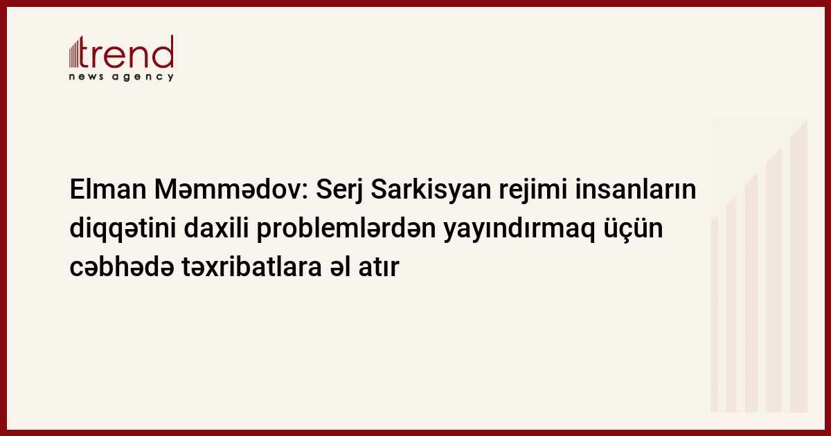 "Ermənistanın cinayətkar hakimiyyəti insanların diqqətini daxili problemlərdən yayındırmaq üçün cəbhə xəttində təxribatlara əl atır". Bunu Trend-ə Milli Məclisin deputatı Elman Məmmədov ermənilərin cəbhə xəttində törətdiyi son təxribatlara münasibət bildirərkən deyib.