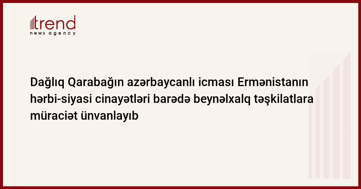 Azərbaycanın Dağlıq Qarabağ bölgəsinin azərbaycanlı icması təmas xəttində Ermənistan silahlı qüvvələrinin həyata keçirdikləri hərbi-siyasi cinayətlərlə bağlı beynəlxalq təşkilatlara müraciət ünvanlayıb.