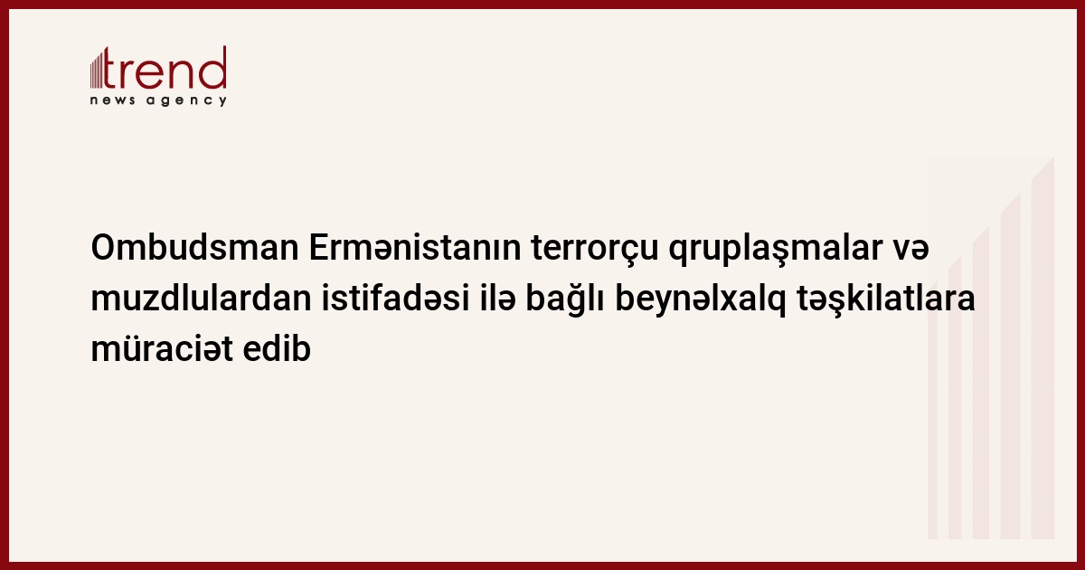 Azərbaycan Respublikasının İnsan Hüquqları üzrə Müvəkkili (Ombudsman) Səbinə Əliyeva Ermənistanın hərbi-siyasi rəhbərliyinin etnik təmizləmə və qeyri-qanuni məskunlaşdırma siyasəti, o cümlədən hərbi əməliyyatlarda terrorçu qruplaşmalardan və muzdlulardan istifadə etməklə Azərbaycana qarşı törətdiyi müharibə cinayətləri barədə beynəlxalq təşkilatlara müraciət ünvanlayıb.