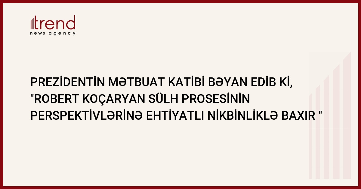 (Mediamaks) - Ermənistan prezidentinin mətbuat katibi Viktor Soqomonyan bu gün İrəvanda bəyan edib ki,"Robert Koçaryan Dağlıq Qarabağ münaqişəsinin nizama salınması üzrə danışıqlar prosesinin perspektivlərinə ehtiyatlı nikbinliklə baxır".