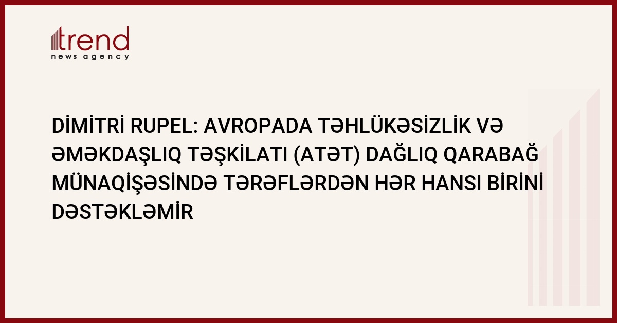 (ARKA) - ATƏT Dağlıq Qarabağ münaqişəsində tərəflərdən hər hanasını dəstəkləmir. Bu barədə ATƏT-in sədri Dimitri Rupel (Dimitrij Rupel) Yerevanda mətbuat konfransında bəyan edib. D.Rupelin sözlərinə görə, görüş zamanı tərəflər Dağlıq Qarabağdakı vəziyyət və onun həlli yollarına dair fikir mübadiləsi aparıblar. O qeyd edib ki, ATƏT hər iki tərəfin tərəfdaşıdır və onun məqsədi münaqişənin nizamlanmasına nail olmaqdan ibarətdir.