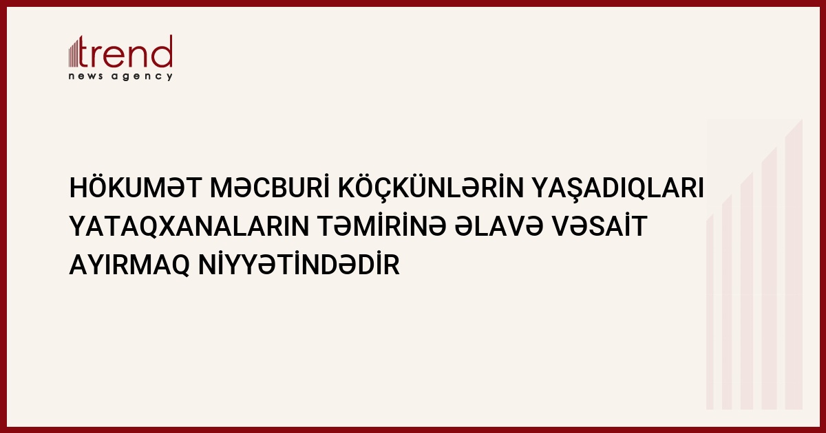 Azərbaycan hökuməti məcburi köçkünlərin müvəqqətit yerləşdirildikləri yataqxanaların təmirinə əlavə vəsait ayırmaq niyyətindədir. Bu barədə Trend ə Azərbaycanın məcburi köçkünlər və qaçqınların işi üzrə Dövlət Komitəsindən məlumat verilib.
