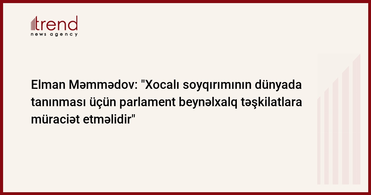 E.Məmmədov Xocalı soyqırımına verilən hüquqi-siyasi qiymət və onun beynəlxalq aləmdə tanınması üçün Azərbaycan Milli Məclisinin lazımi səviyyədə hüquqi əsasları olan qərarının beynəlxalq təşkilatlara göndərilməsini vacib hesab edib.