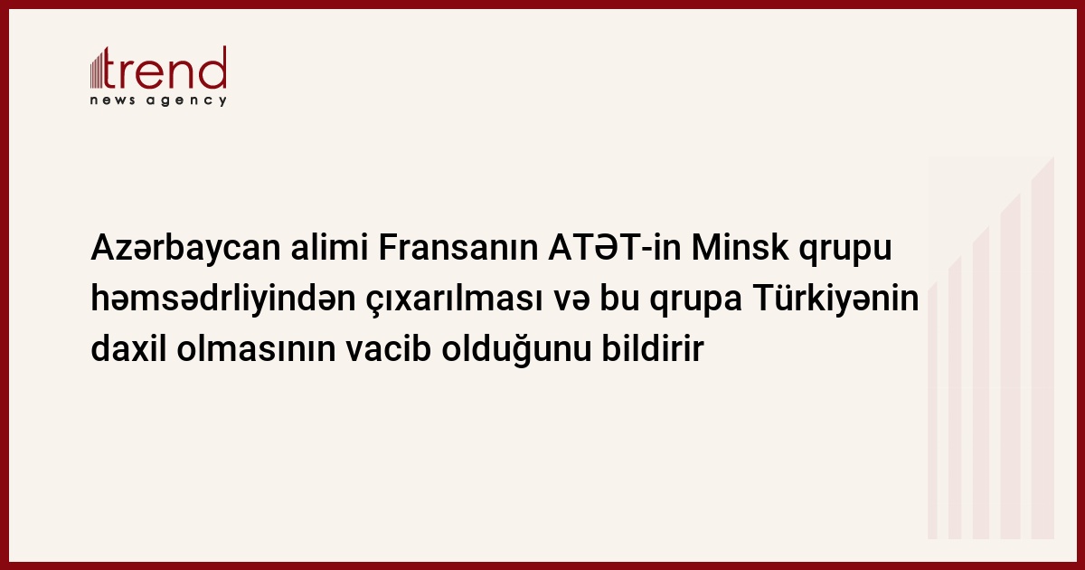 Azərbaycanlı politoloq Fransanın ATƏT-in Minsk qrupu həmsədrliyindən çıxarılmasının və ya həmsədr ölkələrin tərkibinə Türkiyənin daxil olmasının vacibliyini vurğulayıb. Təklifini politoloq onunla əsaslandırıb ki, Minsk qrupunun Əsasnaməsində həmsədr ölkələrin sayı göstərilməyib, əksinə, qeyd ediblib ki, nizamlama prosesinə nə qədər çox ölkə cəlb olunarsa, bir o qədər onların fəaliyyəti səmərəli olar.