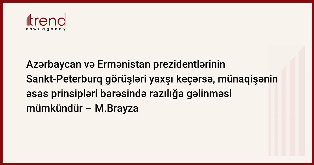 - Həmsədrlərdən biri olaraq mən özüm belə bir fikir səsləndirmişəm və bu, Azərbaycan və Ermənistanın bir çox informasiya orqanları tərəfindən yayılıb. Mən müzakirələrin mövcüd vəziyyətindən ümidvaram. Əgər Sankt-Peterburqdakı görüşlər yaxşı keçərsə, prezidentlərin əsas prinsiplər barəsində razılığa gəlməsi mümkündür.
