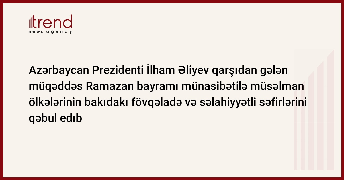 Azərbaycan, Bakı/ Trend Bu gün Azərbaycan Respublikasının Prezidenti İlham Əliyev Prezident sarayında qarşıdan gələn müqəddəs Ramazan bayramı münasibətilə müsəlman ölkələrinin Bakıdakı fövqəladə və səlahiyyətli səfirlərini qəbul edib. Dövlətimizin başçısı müsəlmanların müqəddəs Ramazan bayramı münasibətilə səfirləri təbrik edərək, təmsil etdikləri ölkələrin dövlət və hökumət başçılarına da onun təbriklərini çatdırmağı xahiş edib. Müstəqil dövlət kimi Azərbaycanın indi İslam ölkələri ilə çox fəal əlaqələrinin olduğunu deyən Prezident İlham Əliyev bildirib ki, bu əlaqələr beynəlxalq təşkilatlar çərçivəsində də uğurludur. İslam Konfransı Təşkilatının fəal üzvü olan Azərbaycan xarici siyasətində bu istiqaməti həmişə diqqət mərkəzində saxlayır. Dövlətimizin başçısı İslam həmrəyliyindən də danışıb və əmin olduğunu bildirib ki, müsəlman ölkələri ilə Azərbaycanın qardaşlıq və dostluq əlaqələri gələcəkdə daha da möhkəmlənəcəkdir. Səudiyyə Ərəbistanı Krallığının Azərbaycandakı fövqəladə və səlahiyyətli səfiri, ölkəmizdəki diplomatik korpusun duayeni Əli Həsən Əhməd Cəffər səfirlər adından Prezident İlham Əliyevə təşəkkürünü bildirib. Misirin ölkəmizdəki fövqəladə və səlahiyyətli səfiri Yusif Əhməd İbrahim əl-Şərkavi səfirlər adından birgə bəyanatı oxuyub. Prezident İlham Əliyev səfirləri müqəddəs bayram münasibətilə bir daha təbrik edib, onlara fəaliyyətlərində uğurlar arzulayıb.