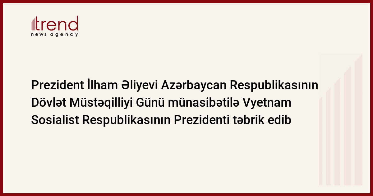 Azərbaycan, Bakı / Trend / Azərbaycan Respublikasının Dövlət müstəqilliyi gününün 16-cı ildönümü münasibətilə Vyetnam Sosialist Respublikasının Prezidenti Nquyen Minh Triet Azərbaycan Respublikasının Prezidenti İlham Əliyevi Vyetnam xalqı adından və şəxsən öz adından təbrik edib.Məktubda deyilir ki,ötən illər ərzində ölkələrimiz arasındakı əlaqələrdə bir çox müsbət irəliləyişlər əldə edilmişdir. Yaxın gələcəkdə Vyetnam və Azərbaycan arasındakı ənənəvi münasibətlərin, çoxtərəfli və qarşılıqlı faydalı əməkdaşlığın xalqlarımızın mənafeyi naminə daha da möhkəmlənəcəyinə və inkişaf edəcəyinə böyük inam ifadə edən Nquyen Minh Triet,həmçinin, Vetnam Sosialist Respublikasının Prezidenti vəzifəsinə yenidən seçilməyi münasibətilə göndərdiyi səmimi təbriklərə görə Azərbaycan prezidentinə təşəkkürünü bildirib.
