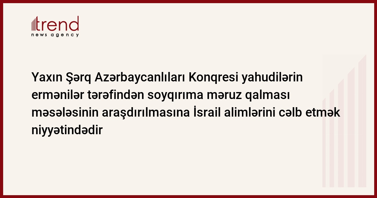 Azərbaycan, Bakı / Trend müxbir R.Məmmədov/ Yaxın Şərq Azərbaycanlıları Konqresi 1918-1919-cu illərdə Azərbaycanda yahudilərin ermənilər tərəfindən soyqırıma məruz qalması məsələsinin araşdırılmasına İsrail alimlərini cəlb etmək niyyətindədir. "Yaxın Şərq Azərbaycanlıları Konqresi kimi yahudilərin Qubada soyqırıma məruz qalması ilə bağlı məsələnin dərindən araşdırılmasını təklif edirik". Bunu Trend ə bazar günü verdiyi açıqlamada Yaxın Şərq Azərbaycanlıları Konqresinin prezidenti Aleks Şapiro-Suliman deyib.